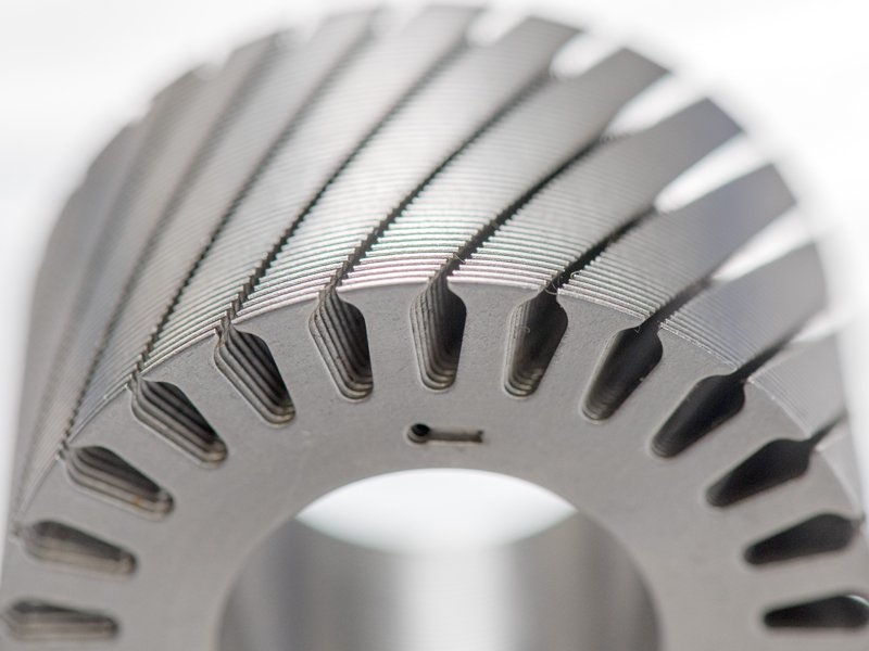 Of course the magnetic and mechanical properties of the material are among the more decisive ones. The thinner the material is, the lower will be the eddy-current losses at high frequencies. The efficiency of the motor increases. This in turn means lower electricity consumption and thus higher distance ranges at the same level of battery capacity.An electric machine can only function efficiently when its core is made of soft magnetic material such as electrical steel. Current-carrying coils generate magnetic fields that are amplified many times over by the electrical steel inside the coils, thus making operation of the motor much more efficient. The space inside the coils must be filled as densely as possible with soft magnetic material to ensure this amplification. A massive block of iron could theoretically be used for this purpose but would have the disadvantage of very high power consumption during operation. Stacks of thin, punched sheets are used in order to minimize the consumption of electricity.