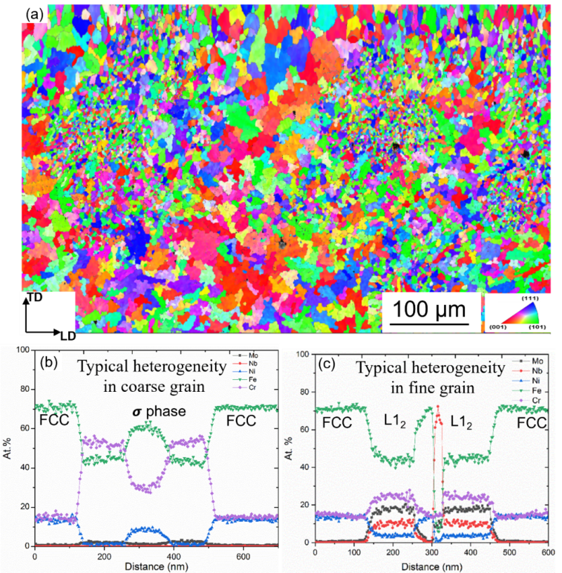 This research successfully fabricated heterogeneous structured 316L stainless steel via coupled ultrasonic additive manufacturing. The alloy exhibits a cross-scale hierarchical microstructure, ranging from millimeter-sized grains, micron-sized cell structures, to Fe-Cr σ phase and L1₂ nano-precipitates distributed at the cell walls, forming a hierarchically gradient microstructure. The study revealed unique cell structure characteristics involving cross-scale and chemical composition perturbations, and clarified the mechanism behind the synergistic effect of multi-stage twinning and metastable cell structures on dislocation slip. The hierarchically heterogeneous 316L stainless steel achieved a tensile strength as high as 1 GPa while maintaining an elongation of approximately 12.5%. This work demonstrates controlled tuning of multi-level heterogeneous microstructures through laser additive manufacturing combined with ultrasonic technology, opening new avenues for microstructure design and manufacturing.