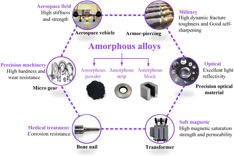 Amorphous alloys, also known as metallic glasses or liquid metals, are novel materials synthesized using modern rapid solidification techniques. Their internal atomic structure is characterized by long-range disorder and short-range order. Due to the unique nature of this internal structure, amorphous alloys combine the excellent mechanical, physical, and chemical properties of both metals and glasses. They exhibit properties such as soft magnetism, superconductivity, low magnetic loss, wear resistance, corrosion resistance, high strength, and high hardness. They have become a major research hotspot in materials science applications and are already widely used in high-tech fields like computers, communications, and power electronics.