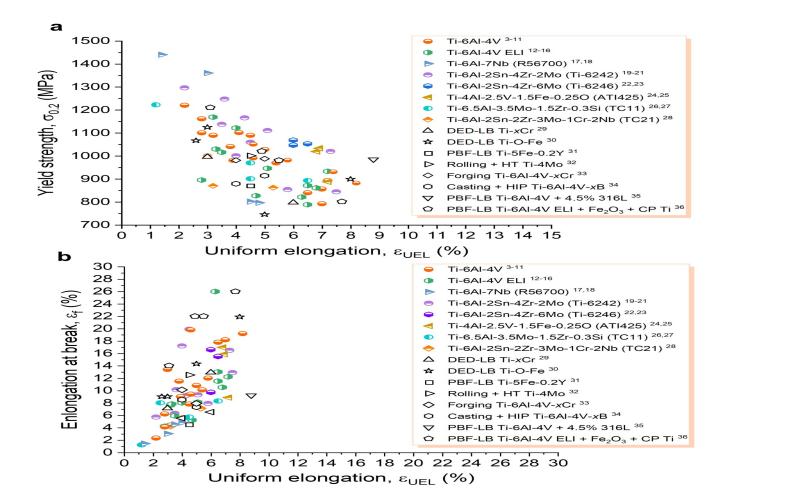 Experimental results show that the Ti-0.45O-4Fe alloy achieves a uniform elongation of over 14% and a total elongation exceeding 27% at a yield strength of ≥980 MPa. The Ti-0.5O-5Fe alloy surpasses a yield strength of 1075 MPa while maintaining a uniform elongation of over 13%, far exceeding the performance levels of existing similar alloys. This breakthrough not only addresses the long-standing strength-plasticity trade-off dilemma but also establishes a novel design paradigm for high-oxygen titanium alloys, providing a new approach for the development of high-performance structural materials.
