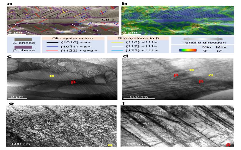 The research team innovatively proposed a dual strategy of 'composition regulation + microstructure engineering.' By increasing the oxygen content to over 0.40%, they successfully activated the <c+a> slip systems on the prismatic planes of the α phase, providing a critical pathway for plastic deformation. At the same time, through Ti-O-Fe alloy design, laser powder bed fusion additive manufacturing, and annealing treatment, they constructed an α-β lamellar microstructure with coherent interfaces, enabling continuous transmission of dislocations across phase boundaries.