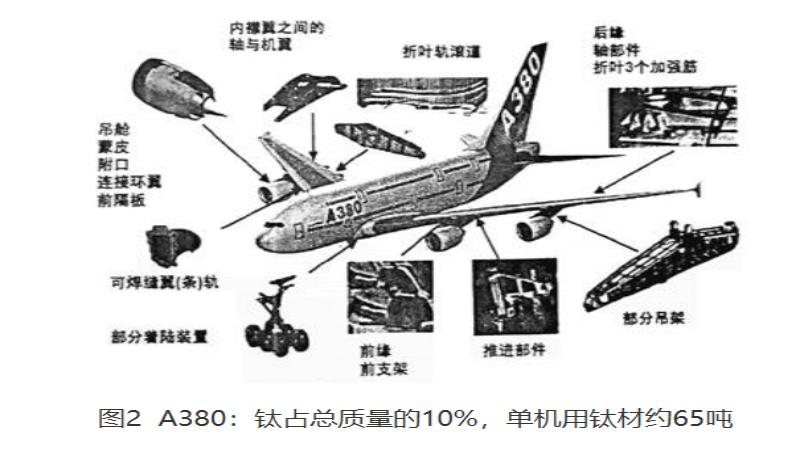 The Airbus A380, Europe's largest wide-body passenger aircraft, is the world's most titanium-intensive civil aircraft. Titanium alloy components account for approximately 10% of the total net weight, with a single aircraft consuming about 65 tons of titanium. Key titanium alloy components (see Figure 2) include: engine nacelle, skin, flanges, connecting ring wings, front bulkhead, shafts between inner flaps and wings, folding rail tracks, trailing edge, shaft components, three folding rib reinforcements, engine section brackets, propulsion components, leading edge, front brackets, partial landing gear, and weldable wing (bar) rails.