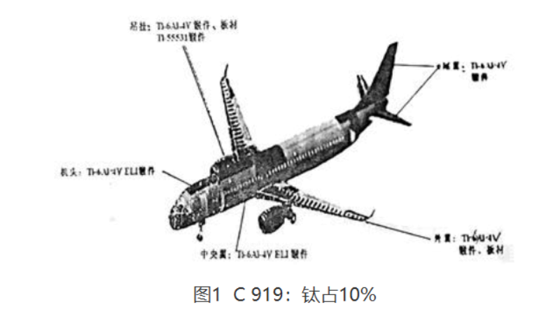 Titanium materials have been widely used in the manufacturing of large civil aircraft. Some key components of landing gears and wheels are forged from titanium alloys, while a small number of parts are forged from aluminum alloys. In the C919 large aircraft, the net mass of titanium alloy components accounts for about 10% of the total net mass of the aircraft. Among civil aircraft manufactured in China, titanium is the most extensively used material. Which components are made of titanium (see Figure 1): the nose uses Ti-6Al-4VEVI forgings; the suspension uses Ti-6Al-4V alloy forgings, plates, and Ti-55531 alloy forgings; the tail fin uses Ti-6Al-4V alloy forgings; the outer wing uses Ti-6Al-4V alloy forgings and plates; the central wing uses Ti-6Al-4V ELl alloy forgings; and the landing gear system uses Ti-6Al-4V alloy forgings.