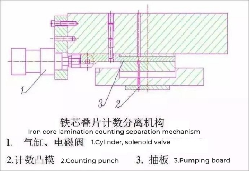 There is a pumping plate mechanism on the counting punch, the pumping plate is driven by the cylinder, the action of the cylinder is controlled by the solenoid valve, and the solenoid valve moves according to the instructions issued by the control box. Each stroke signal of the punching machine is input into the control box. When the set number of pieces is punched, the control box will send out a signal to make the pumping plate move through the solenoid valve and the cylinder, so that the counting punch can achieve the purpose of counting and separation. That is to say, the purpose of punching through the metering hole and not punching the metering hole is achieved at the riveting point of the punching sheet. The lamination thickness of the iron core can be set by yourself. In addition, due to the needs of the supporting structure, the shaft holes of some rotor cores are required to be punched with 2 or 3 shoulder counterbores.