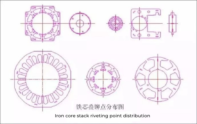 The setting and quantity determination of core stacking riveting: the selection of the position of core stacking riveting points should be determined according to the geometric shape of the punching sheet, and at the same time, taking into account the electromagnetic performance and use requirements of the motor, the position of the stacking riveting points should be considered on the mold. Whether there is interference in the positions of the punch and die inserts and the strength of the distance between the position of the corresponding stacked riveting ejector pin hole of the blanking punch and the edge. The distribution of stacked riveting points on the iron core should be symmetrical and uniform. The number and size of stacked riveting points should be determined according to the required bonding force between the iron core punches, and the manufacturing process of the mold must be taken into account. For example, if there is a large-angle rotary stacking riveting between the iron core punching pieces, the equal division requirements of the stacking riveting point should also be considered.