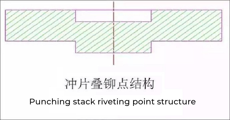 Punch out certain geometrical overlapping riveting points on the appropriate parts of the stator and rotor punching sheets. The form of the overlapping riveting points is shown in Figure 2. The upper part is a concave hole and the lower part is convex. Then, the upper part of the same nominal size When the convex part of the punching sheet is embedded into the concave hole of the next punching sheet, an "interference" is naturally formed in the tightening ring of the blanking die in the mold to achieve the purpose of fastening the connection, as shown in Figure 3. The process of forming the iron core in the mold is to make the convex part of the stacking point of the upper piece correctly overlap with the concave hole of the stacking point of the lower piece at the punching and blanking station. When the pressure of the material punch acts, the reaction force generated by the friction between the shape and the die wall of the lower piece makes the two pieces overlap.