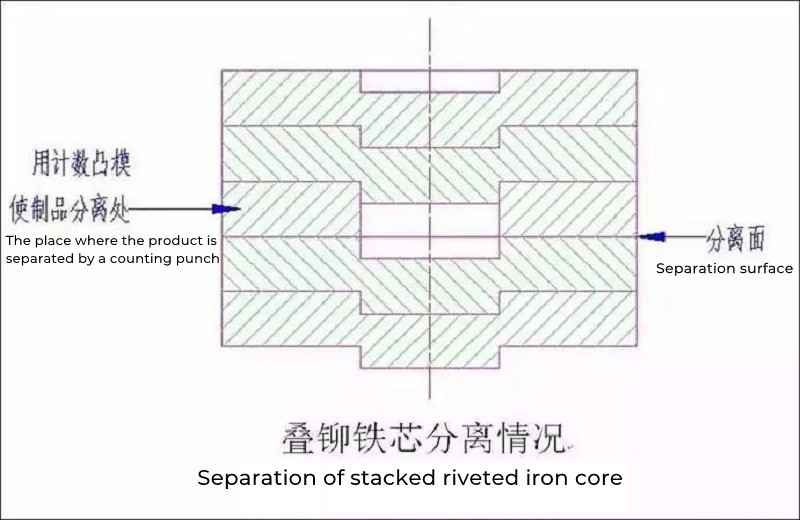 The control method for the thickness of the core laminations is to punch through the riveting points on the last punched sheet when the number of iron cores is predetermined, so that the iron core is separated according to the predetermined number of pieces. An automatic lamination counting and separating device is provided on the mold structure.